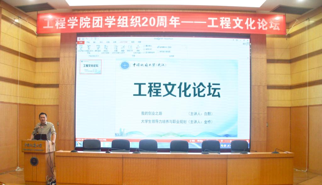 在工程文化论坛上,pp电子官方网站第二届团委副书记、武汉市洪山区水务局局长金桥,pp电子官方网站第六届学生会副主席、北京金景科技有限公司董事长白颢分别作了题为《我的创业历程》、《大学生管理能力提升与职业规划》的主题报告。