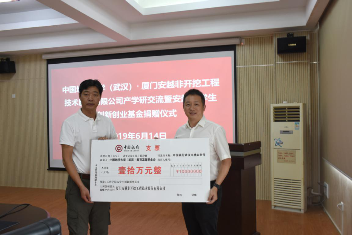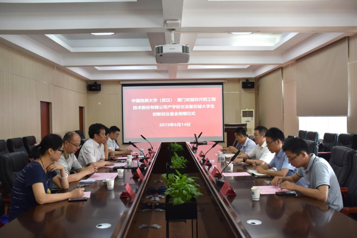 2019年6月14日上午,厦门安越非开挖技术股份有限公司来校作产学研交流,并捐赠10万设立安越大学生创新创业基金,捐赠仪式在315举行。厦门安越非开挖技术股份有限公司董事长廖宝勇一行、武汉中地大非开挖研究院有限公司总经理孔耀祖,校友工作与教育基金管理处副处长吕占峰、丁苗苗,pp电子官方网站党委书记陈飞、党委副书记江广长、副教授曾聪参加会议。江广长主持会议。