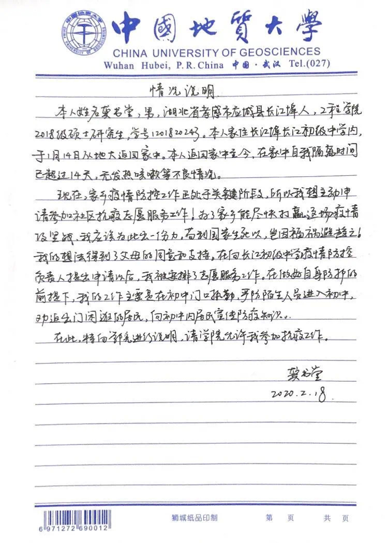 姚文昊 罗卓立 杨昊讯)龚书堂是pp电子2018级土木工程硕士研究生,他响应学院学校号召,担任抗击疫情一线的志愿者。