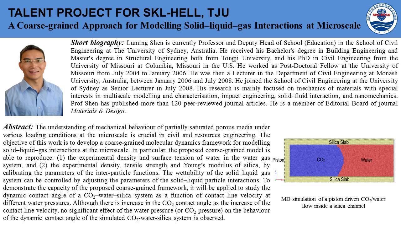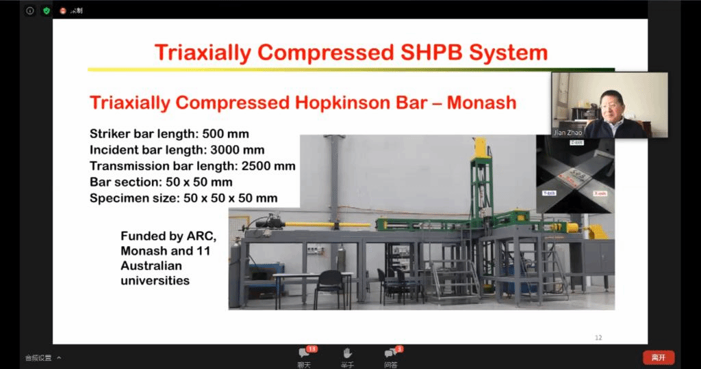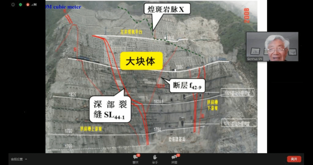 pp电子官方网站院长焦玉勇教授作为国际岩石力学与岩石工程学会非连续变形分析专委会主席牵头组织并主持了此次云论坛会议,石根华教授基于数十年的关键块体理论研究工作,介绍了关键块体理论的发展、基本原理及采用赤平投影方法将2D关键块体理论拓展的3D关键块体理论,并且用多个实际工程演示了关键块体理论的坝基、硐室分析应用;赵坚教授以岩石动力学实验及实验设备为出发点,简述了霍普金森杆(SHPB)在高加载率动力学实验中的应用和真三轴SHPB的发展过程及其特性与应用领域;沈鲁明教授以气-液-固一体化微观数值计算方法为核心,介绍了CGMD(coarse-grained molecular dynamic)数值方法,详细阐述了CGMD中多相相互作用关系,并以数值实验对CGMD进行验证,最后介绍了CGMD方法模拟CO2-水-SiO2系统各相介质之间的相互作用。