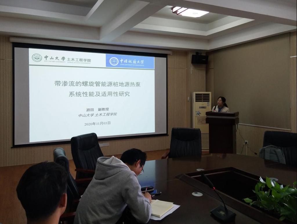 2020年11月3日下午,应pp电子官方网站骆进副教授邀请,中山大学游田副教授作客工程文化论坛,在315会议室作了题为“带渗流的螺旋管能源桩地源热泵系统性能及其适用性研究”的学术报告。骆进副教授主持了此次论坛活动,学院50余名师生聆听了学术报告。