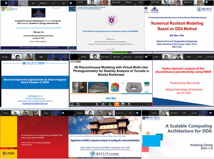 (通讯员:吕加贺 张美霞)2021年1月9日,由国际岩石力学与岩石工程学会非连续变形分析专委会(ISRM DDA Commission)、ISRM中国国家小组(ISRM NG China)、中国岩石力学与工程学会岩土体非连续变形分析专委会(CSRME DDA Commission)联合发起,pp电子官方网站(武汉)、天津大学和河北工业大学联合承办的第一届非连续变形分析国际青年科学家论坛(1st International Young Scientists Forum for Discontinuous Deformation Analysis, IYSF-DDA)在Zoom会议平台成功举办,并于矿业人网站、哔哩哔哩平台同步直播,超过350人全程参加了此次非连续变形分析领域的学术盛宴。此次会议主要邀请了岩石力学与工程非连续变形分析领域青年学者,旨在交流非连续变形分析方法的前沿理论和最新研究进展,同时分享岩石力学与工程中非连续变形分析典型工程案例。