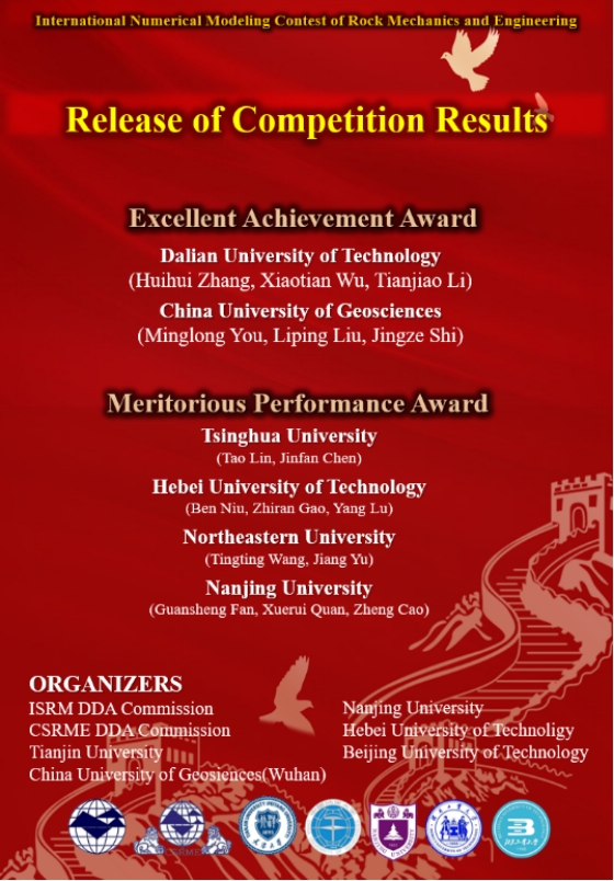 本次大赛由国际岩石力学与岩石工程学会非连续变形分析专委会(ISRM DDA)联合中国岩石力学与工程学会岩土体非连续变形分析专委会(CSRME DDA)及pp电子官方网站(武汉)、天津大学、南京大学、北京工业大学、河北工业大学等多所高校联合举办,于2021年第十一届亚洲岩石力学大会(ARMS11)期间同步举行。大赛鼓励研究生对岩石力学问题的现有数值方法和软件进行公开、透明和广泛的验证,为共享岩石力学问题的实验和数值结果提供平台。