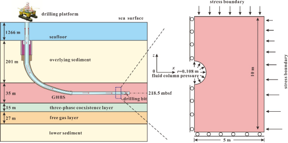 鉴于此,pp电子官方网站(武汉)pp电子官方网站宁伏龙教授团队根据南海神狐海域第一次试采站位的地质资料,构建了水合物储层水平井钻进状态模型(图1)。详细研究了不同钻井液性能、水合物饱和度以及束缚水饱和度对钻进过程中井筒状态的影响规律。并在此基础上,讨论了井筒内二次水合物生成的潜在区域以及低渗泥皮形成对井壁稳定的影响。