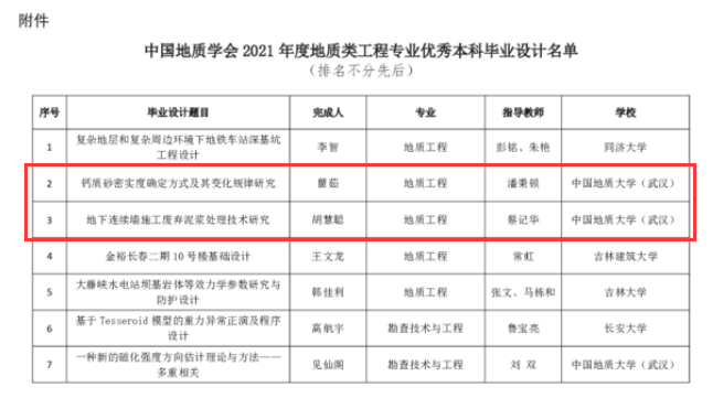 pp电子本科毕业生瞿茹的《钙质砂密实度确定方式及其变化规律研究》和胡慧聪的《地下连续墙施工废弃泥浆处理技术研究》获奖, 指导老师分别为勘察与基础工程系潘秉锁教授和蔡记华教授。中国地质学会将对获奖个人进行表彰,向获奖的毕业设计完成人和指导教师颁发荣誉证书。