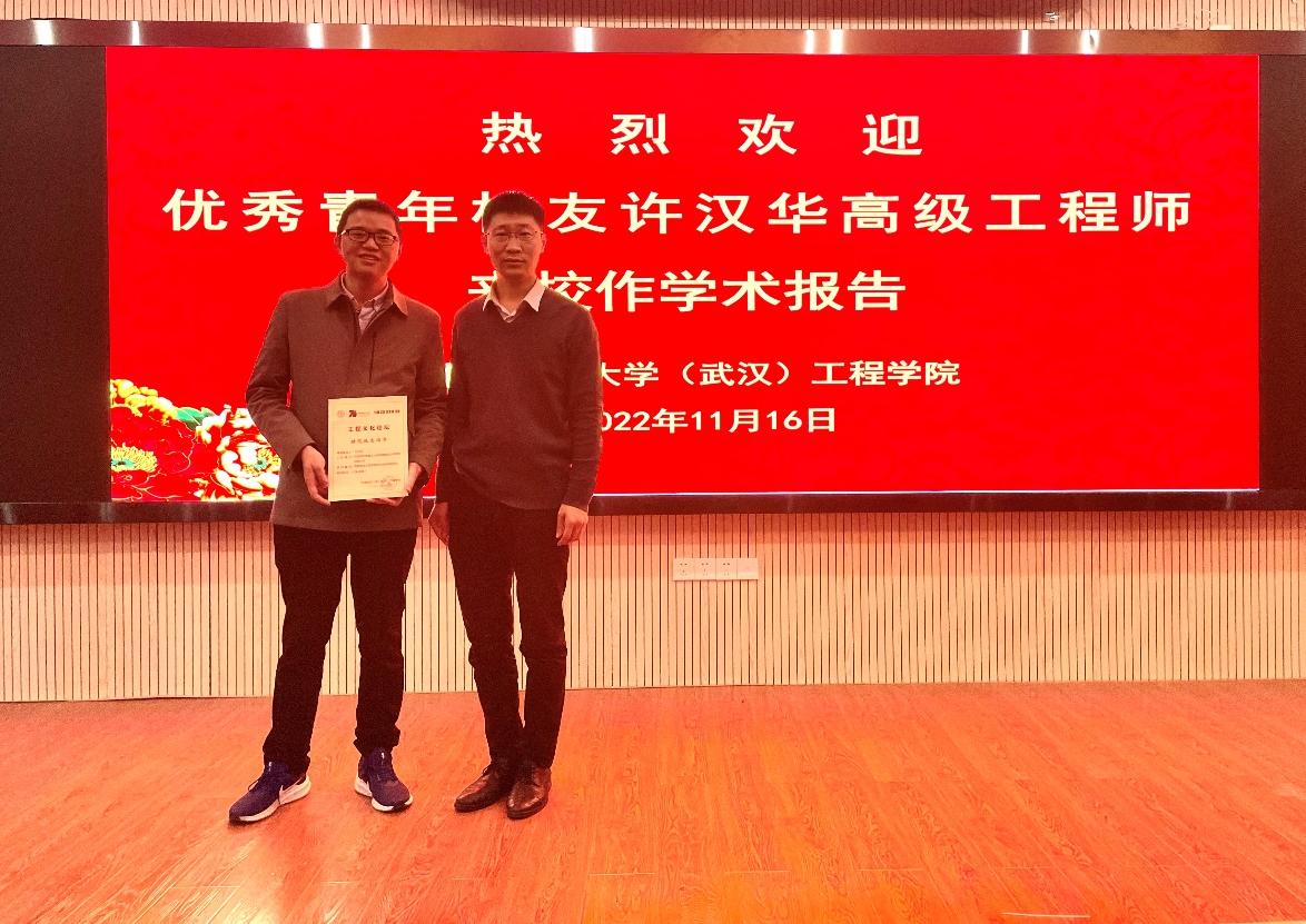 邹俊鹏特任教授对报告进行了总结发言,向许汉华高级工程师颁发了pp电子官方网站(武汉)70周年校庆系列学术活动工程文化论坛特邀报告证书,并合影留念。