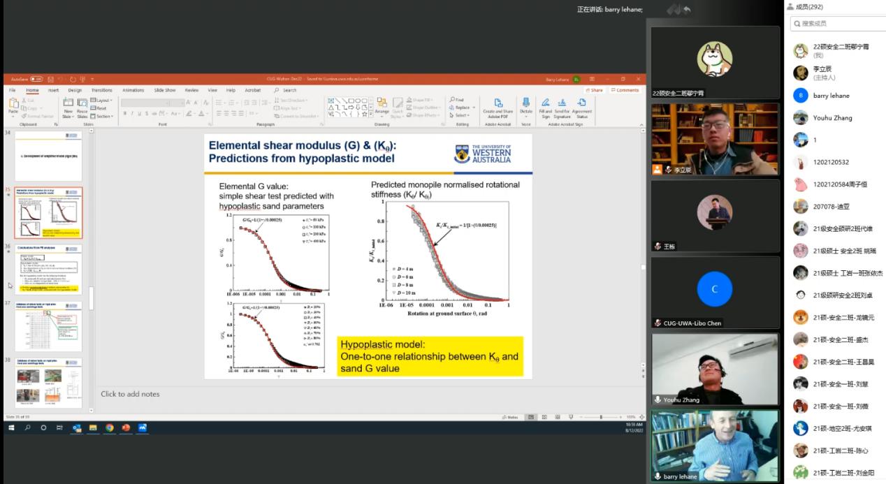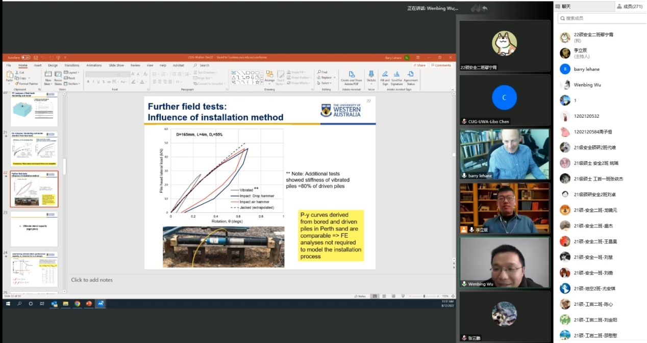 (通讯员 李立辰 黄静)12月8日上午,应pp电子官方网站吴文兵教授与李立辰博士的邀请,西澳大学Barry Lehane教授做客工程文化论坛,为pp电子师生进行线上学术报告。此活动为pp电子官方网站(武汉)70周年校庆系列学术活动之一。pp电子官方网站勘察与基础工程系博士后李立辰主持报告,300余名师生与行业专家参加了本次活动。