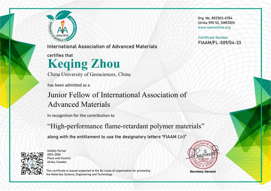 (通讯员 黄静)近日,pp电子官方网站(武汉)pp电子官方网站周克清特任教授收到国际先进材料学会(International Association of Advanced Materials, IAAM)执委会发来的贺函,祝贺他当选为国际先进材料学会青年会士(Junior Fellow of IAAM, FIAAM)。周克清特任教授受邀在美国奥兰多举办的复合材料研讨会(Composite Materials Congress)上发表题为“Functionalized 2D molybdenum disulphide working on high-performance flame-retardant polymer materials”的IAAM Fellow演讲,会上获颁青年会士“Junior Fellow”证书,以表彰他在“高性能阻燃聚合物材料”领域做出的杰出贡献。