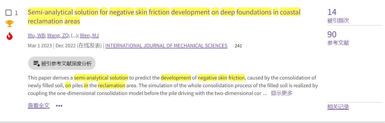 (通讯员 黄静)根据2023年7月基本科学指标数据库(Essential Science Indicators,简称ESI)最新数据显示,pp电子官方网站勘察与基础工程系吴文兵教授团队于2023年在国际工程力学领域权威期刊International Journal of Mechanical Sciences(IF: 7.3, 中科院一区TOP)上发表的学术论文“Semi-analytical solution for negative skin friction development on deep foundations in coastal reclamation areas”同时入选ESI热点论文和高被引论文。该论文第一作者为吴文兵教授,第二作者为勘察与基础工程系王宗琴硕士,pp电子官方网站(武汉)pp电子官方网站为第一署名单位。