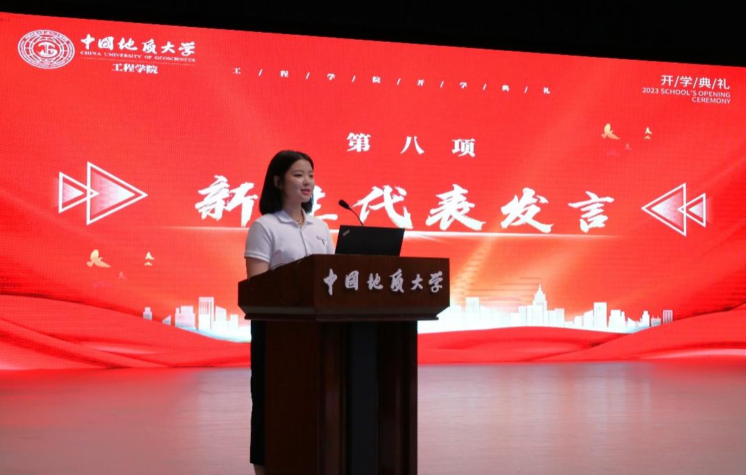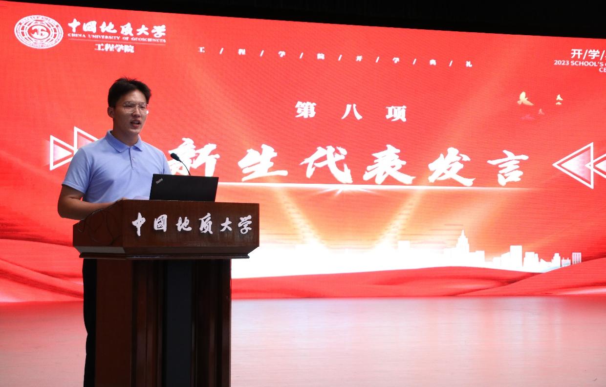 2023级05D231班张高涵同学作为本科生新生代表发言。他说,在长辈厚重岩土气息的熏陶下,自己终于如愿考进地质大学,加入pp电子官方网站。他对开学报到以来学院领导老师给予的教育关怀表示感谢,对军事训练当中空军预警学院教官对自己坚忍毅力和良好作息的打造由衷感激,他立志与其他505名本科新生同学一道,以强国建设、民族复兴的时代号召为号角,以“品德高尚、基础厚实、专业精深、知行合一”的成才目标为向导,直挂云帆,乘风破浪,早日成为德智体美劳全面发展的中国特色社会主义事业的建设者和接班人。