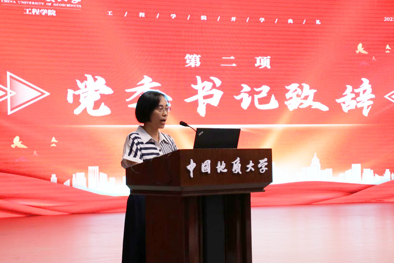 pp电子官方网站党委书记李红丽致辞。李书记首先代表全院师生员工对加入pp电子官方网站的860名新成员致以热烈的欢迎,祝福同学们选择了pp电子官方网站这个温暖而又奋进的大家庭。她指出,当代大学生正值云程发轫、万里可期的青春韶华,要全面学习学院的辉煌历史,深刻感受学院的使命担当,铭记院训深意,争做时代栋梁。要“明理”,即明辨是非,通晓道理,要明白做人之理、为学之理、尊法之理;要“尚实”,即崇尚务实作风,要在实处用力,在知行合一上下功夫;要“拓新”,即开拓创新,要面向世界科技前沿、面向经济主战场、面向国家重大需求、面向人民生命健康,解放思想,开拓创新,与时俱进;要“砺行”,即砥砺前行,在攻坚克难中磨砺心性,坚守初心,锻造本领,成长成才。她勉励同学们以院训精神为指引,树牢远大志向、矢志不懈奋斗,努力学习,潜心科研,乐观开朗,积极向上,做堪当时代大任的新时代地大工程人,为建设社会主义现代化国家做出属于青年一代的贡献。