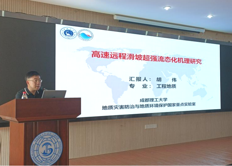 胡伟教授作了题为“高速远程滑坡超强流态化机理研究”的学术报告。围绕“高速远程滑坡动力学机制”这一科学问题,揭示了高速远程滑坡高速滑动阶段滑面超低摩擦机理和远程运动阶段滑坡体剪切碎裂超强流态化波动减阻机理,构建了考虑滑面超低摩擦及滑体超强流态化机制的滑坡动力学模型,实现了对高速远程滑坡动力学过程更准确的量化分析。胡伟教授的研究成果应用于多处相关灾害的预测预报及风险评估,为准确确定致灾距离及范围提供了重要理论依据。