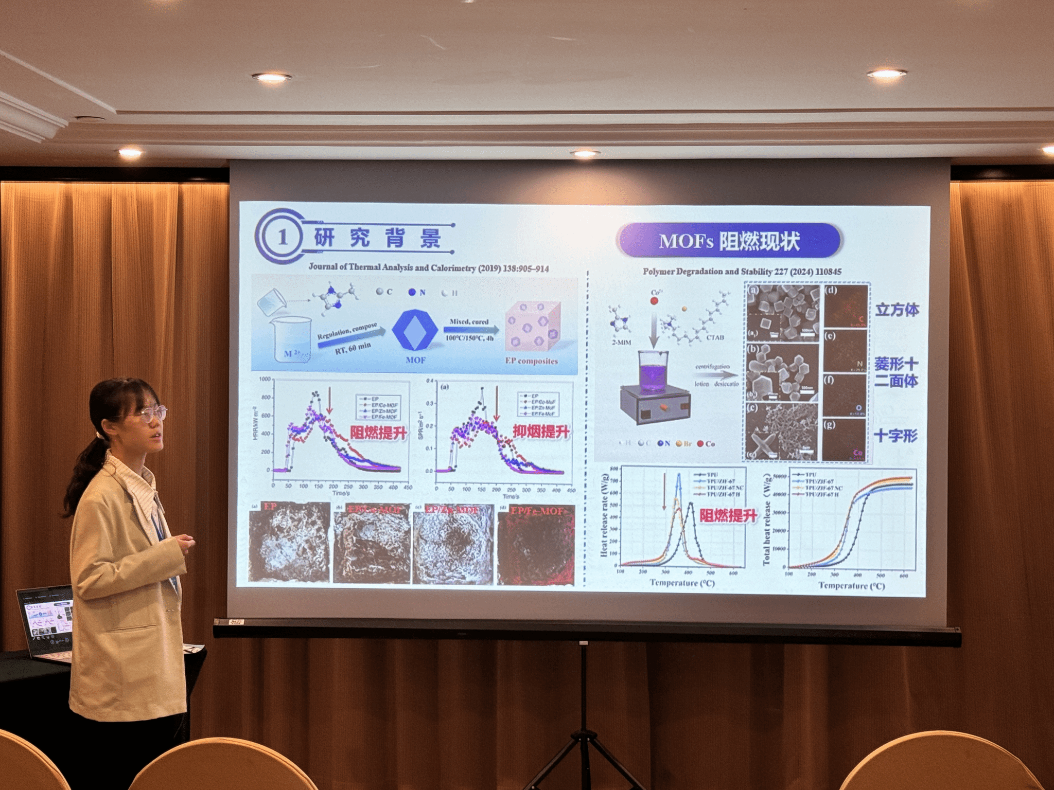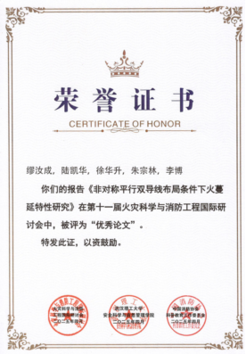 此外,pp电子研究生印恋在阻燃耐火论坛作题为“卟啉基有机框架衍生物分子设计及其阻燃增韧研究”报告、罗瑊瑊在阻燃耐火论坛作题为“生物启发微中空MOFs的界面锁定效应:环氧树脂复合材料的耐火与增韧性能优化研究”报告、缪汝成在火灾机理论坛作题为“非对称平行双导线布局条件下火蔓延特性研究”报告,孟祥龙在火灾烟气论坛作题为“空气幕射流作用下的开口溢流发展行为研究”报告,宗志伟在受限空间火灾论坛作题为“墙角型壁面限制条件下的火羽流行为特性研究”报告。其中,陆凯华副教授指导的硕士研究生缪汝成获得会议优秀论文奖。