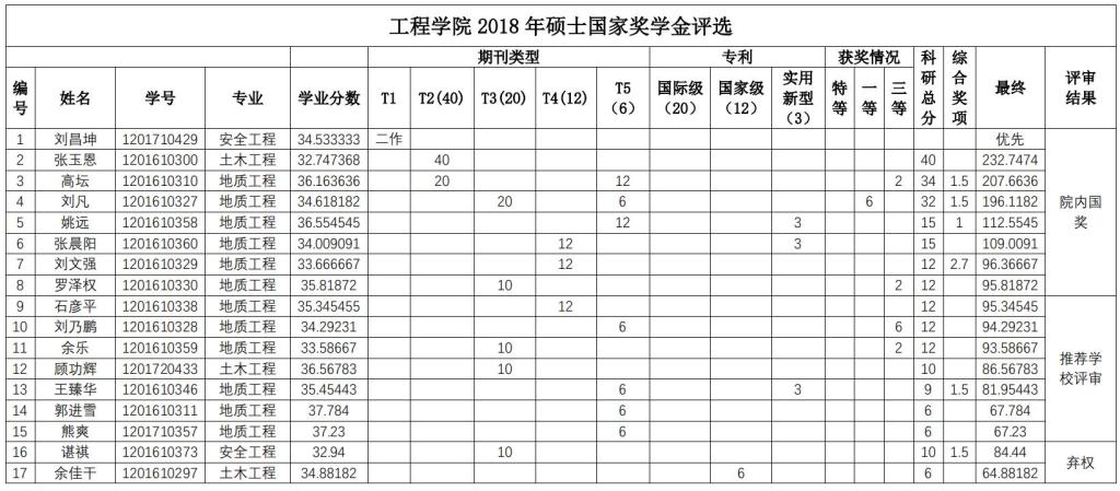 经个人申报,学院研究生国家奖学金评审委员会秘书处资格审查,学院研究生国家奖学金评审委员会于2018年9月29日下午组织通过资格审查的申报者(其中博士研究生14人,硕士研究生17人)进行答辩评审,学院研究生国家奖学金监审委员会全程监督。会议确定了刘昌坤等8名硕士研究生,刘浩等4名博士研究生为pp电子官方网站2018 年研究生国奖学金候选人。现将pp电子官方网站 2018 年国家奖学金候选人公示(见下表)。