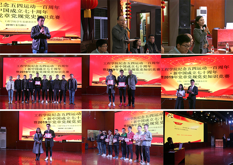2019年3月29日晚18:30,pp电子官方网站“纪念五四运动一百周年·新中国成立七十周年暨2019年党章党规党史知识竞赛”复赛、决赛在东区教职工活动中心举行。pp电子官方网站党委书记陈飞、副书记江广长,校党委组织部李雨竹,pp电子官方网站学工组辅导员丁继国、文新、王焱出席活动。