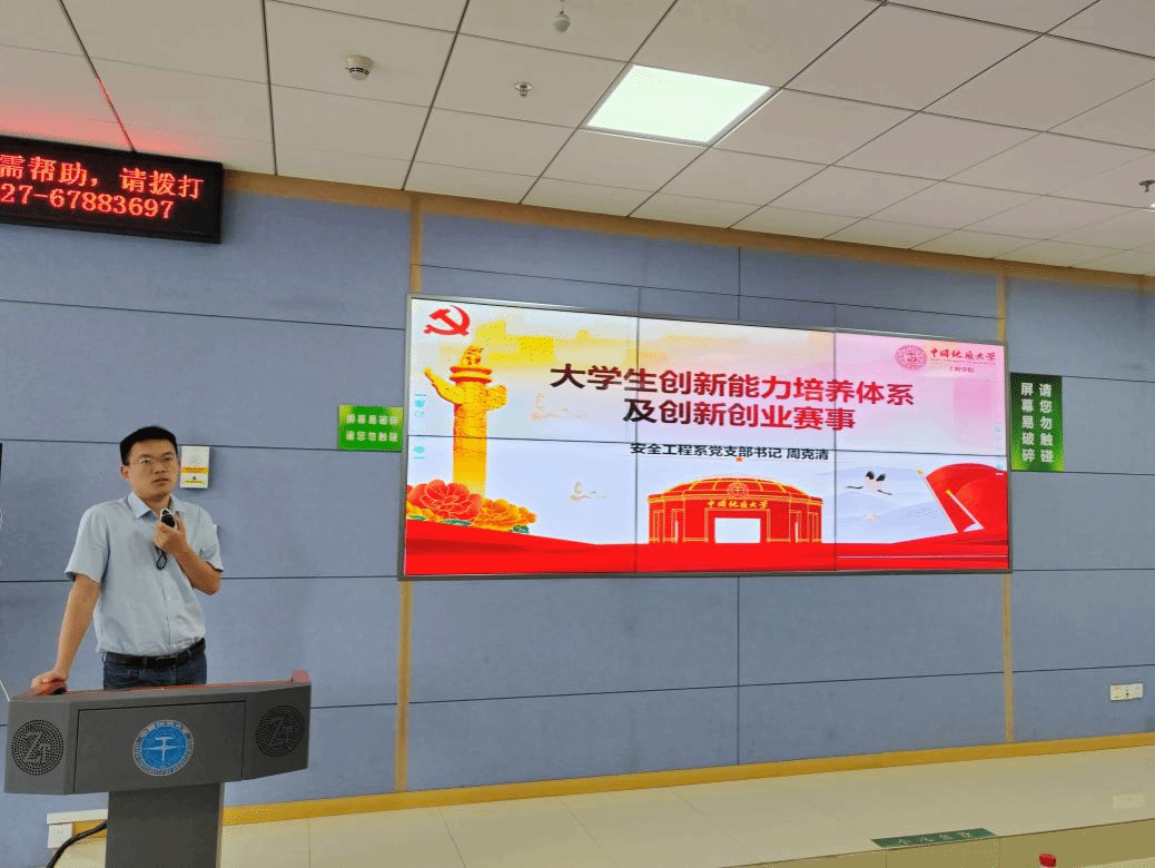 (通讯员 刘宜之 彭友元 )为深入推进“党建+双创”育才模式,助力学生明晰科创路径、点燃创新火种,pp电子官方网站安全工程系党支部于2025年6月24日下午14:30,在南望山校区东教C106教室举办以“赋能成长加速器,点燃青创新火种”为主题的创新创业大讲堂。本期大讲堂主讲人包括“强国行”专项行动团队负责人、安全工程系党支部书记周克清教授,安全工程系郭良杰副研究员,安全工程系优秀研究生和本科生代表印恋、张佳乐、刘宜之,参会人员为2024级安全工程系全体本科生。会议由2024级本科生辅导员彭友元主持。