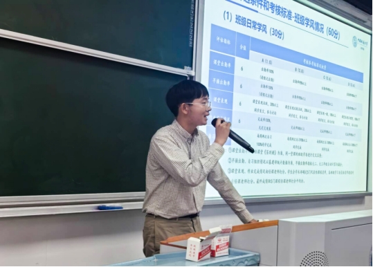 2024级辅导员彭友元介绍《pp电子官方网站(武汉)pp电子官方网站“优良学风示范班”创建评选办法》。他从“优良学风示范班”总体要求、创建流程、考核指标、奖惩办法等四个方面进行介绍,重点解读了班级政治理论学习、遵纪守法与文明修养、集体观念、班级制度建设、班级干部表现等5项班级综合表现指标,课堂出勤、早操出勤、课堂表现、作业完成情况、自习组织情况等5项班级日常学风指标,平均学分绩点、优秀率、及格率和英语四级通过率等4项班级课程成绩指标,以及学生参加科技创新活动等附加分项目指标。他要求同学们仔细阅读创建办法文件,对照量化评估考核指标,积极开展富有班级特色的学风建设活动。